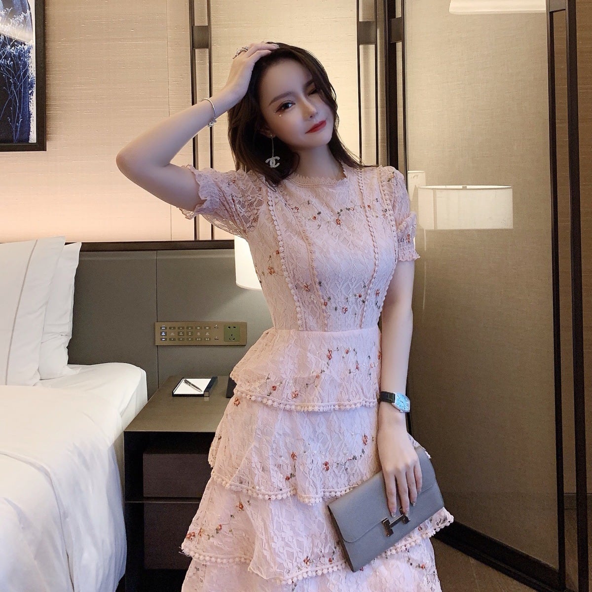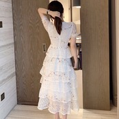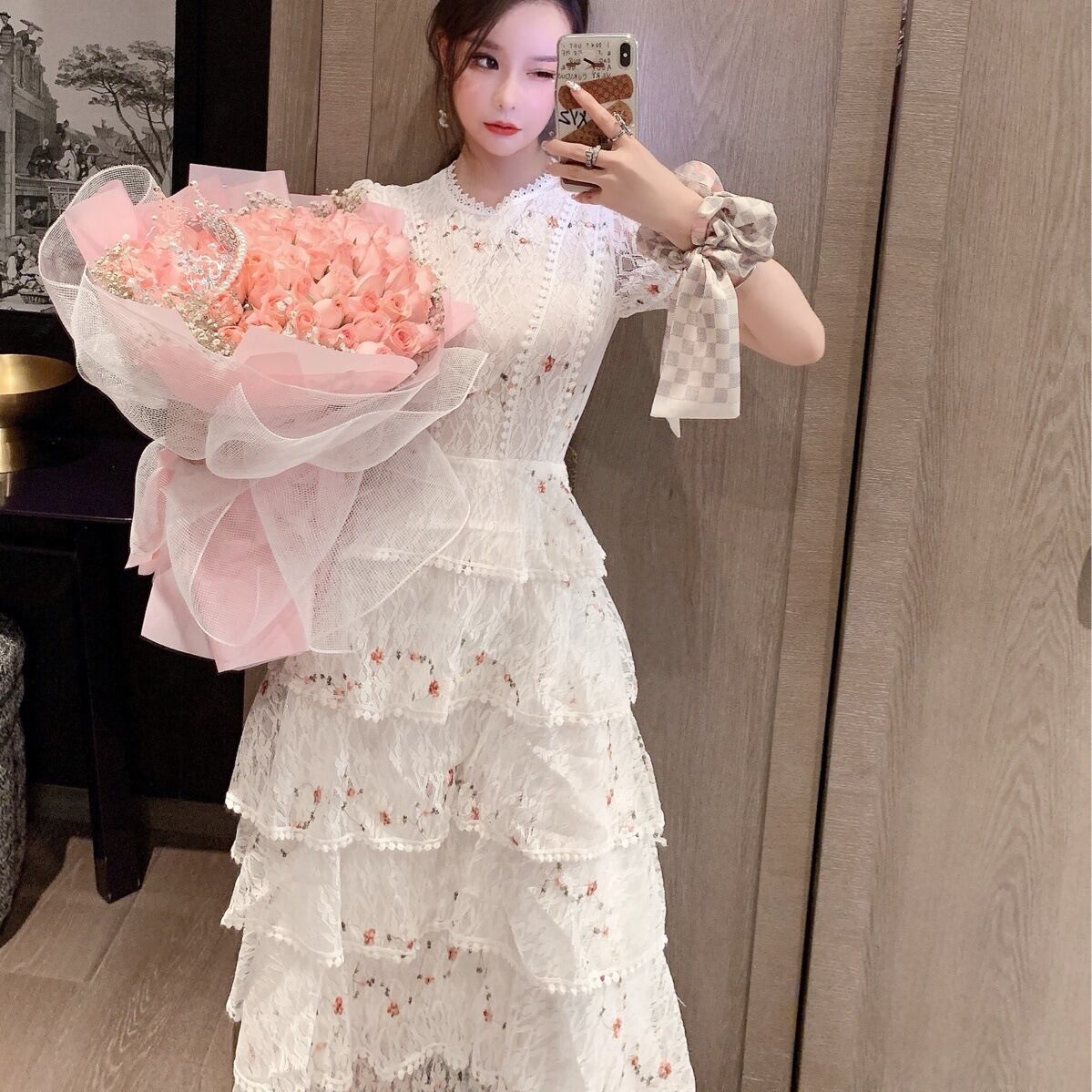 花柄レース刺繍ドレス半袖白ピンク結婚式イベントクリスマスパーティー韓国キャバクラブワンピース