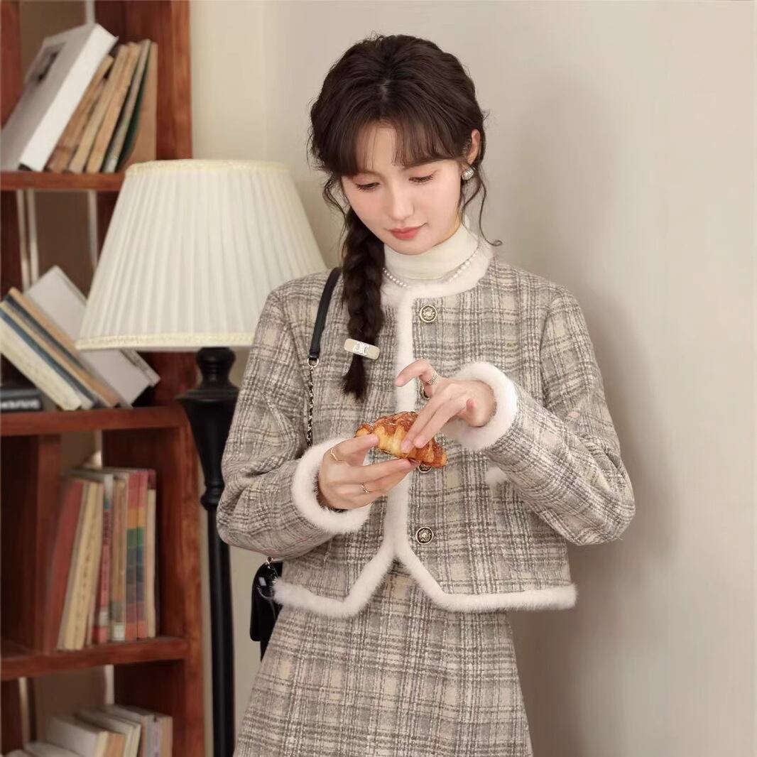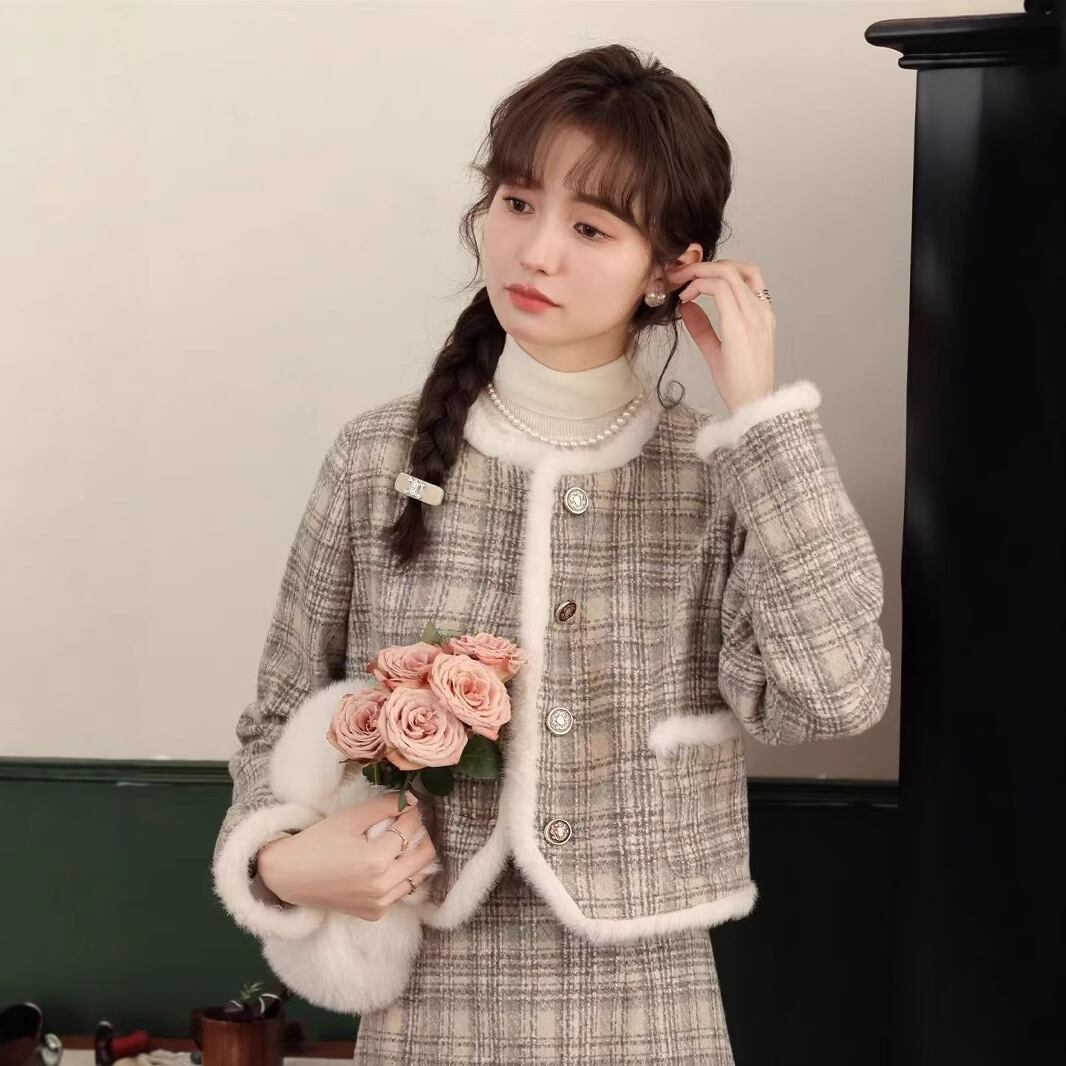 【即納】ジャケット+スカートのツーピースセットアップチェック2025年冬の新作ファー
